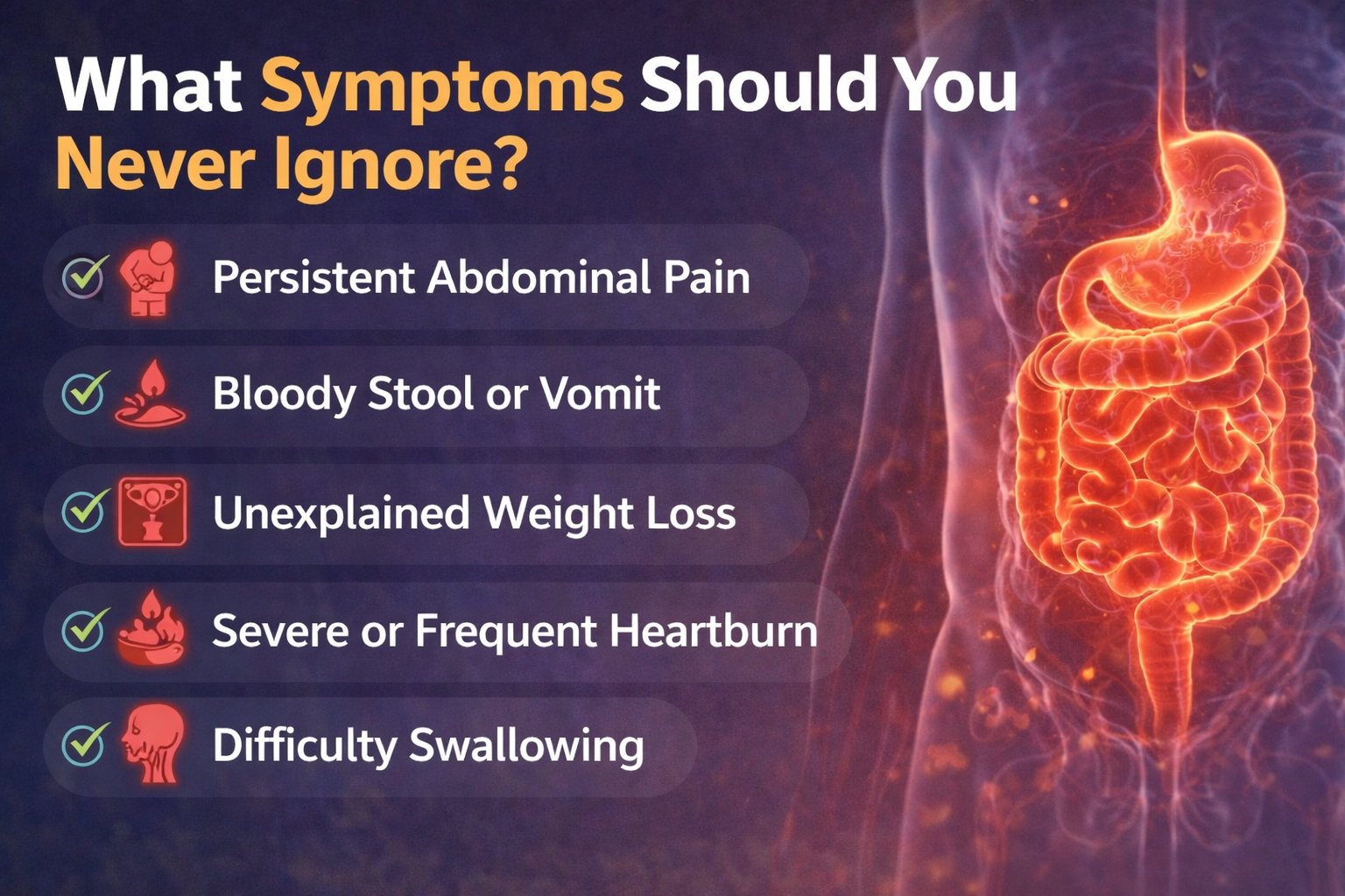 Your body gives warning signs. Persistent stomach pain, nausea, vomiting, bloating, frequent acidity, loss of appetite, and weight loss should not be ignored.