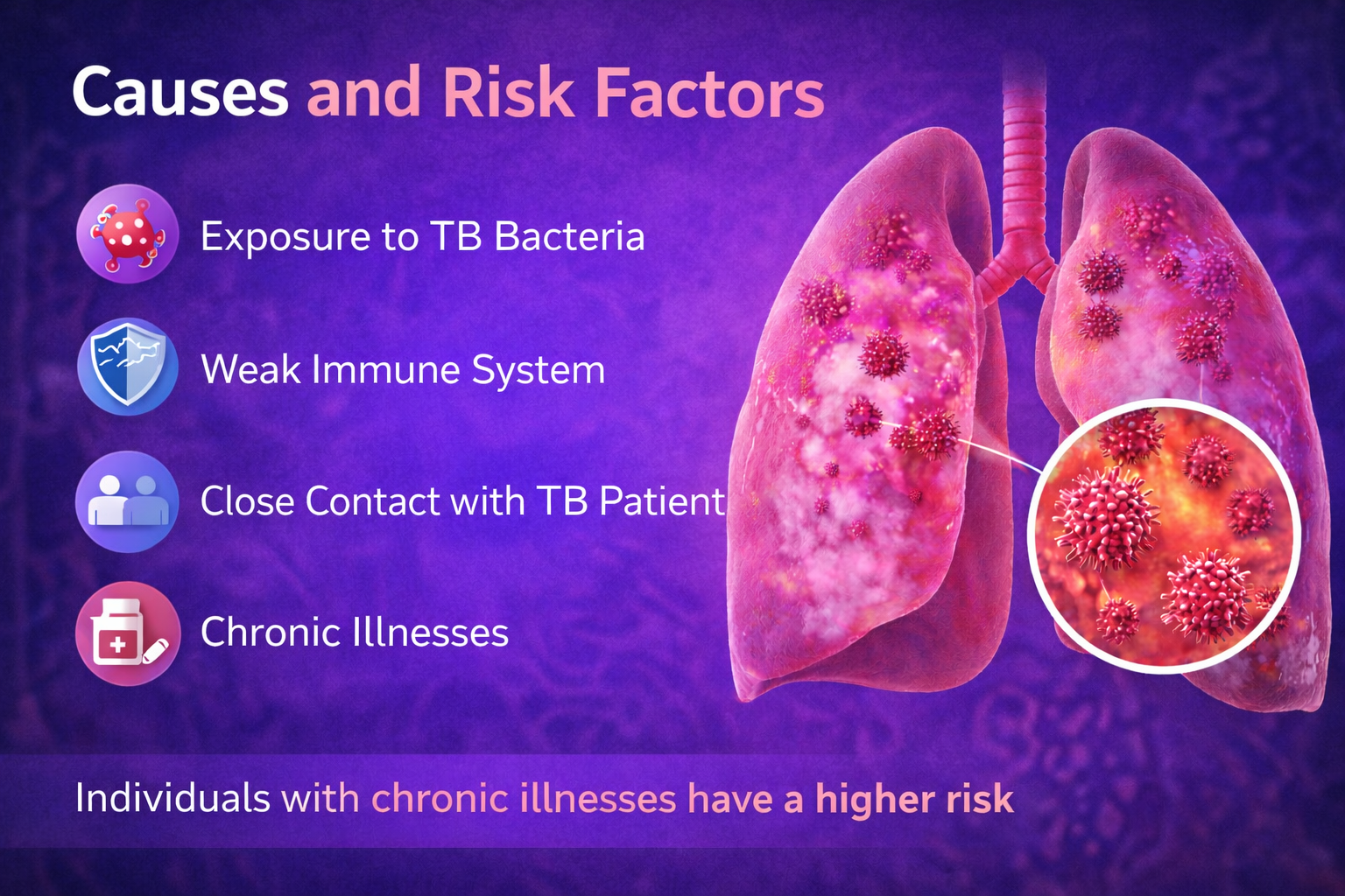 Mycobacterium tuberculosis is the main cause of TB Pneumonia. There are however, some risk amplifying factors: