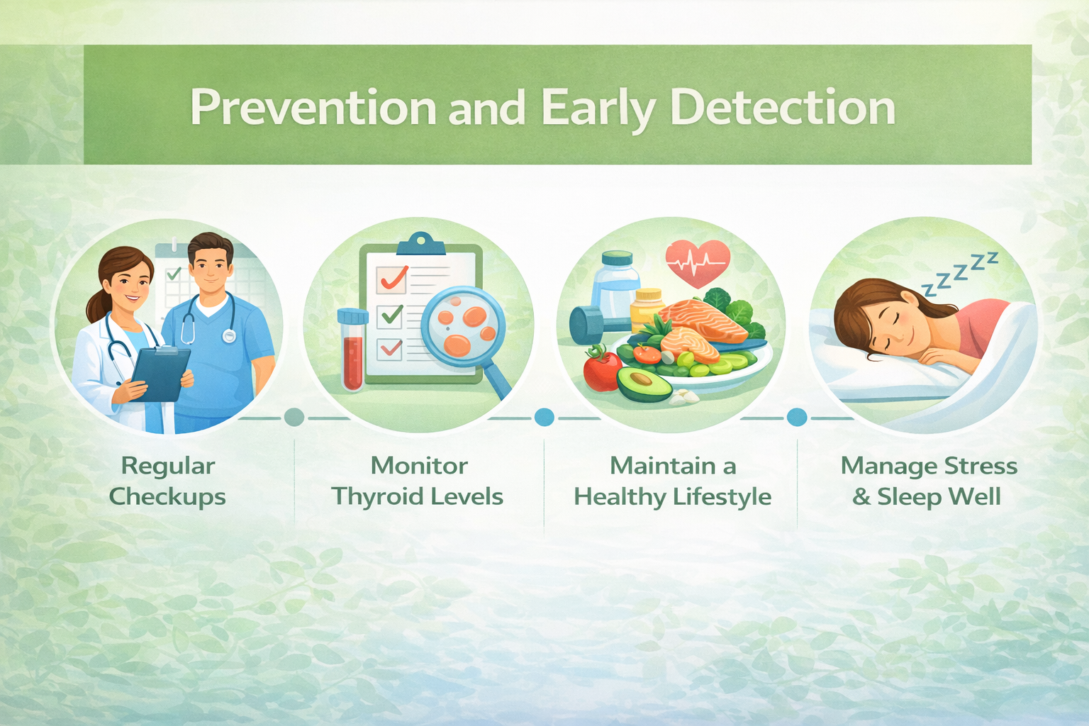 Prevention involves a well-balanced diet that is rich in iodine, selenium, and zinc, management of stress, frequent checkups, and prompt attention to symptoms.