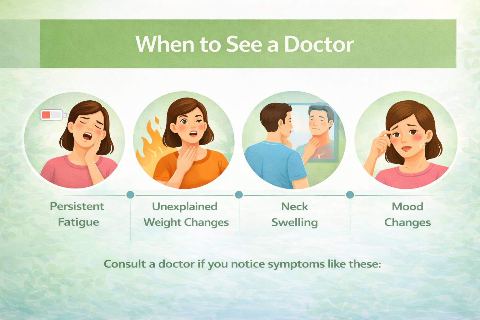 See the doctor in case of unexplained fatigue, sudden weight gain or loss, swelling in the neck, palpitations, and mood changes. Adequate childhood care helps to avoid complications.